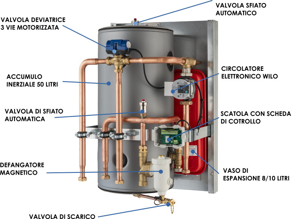L’accumulatore inerziale ottimizza il funzionamento della pompa di calore limitando al minimo i cilcli di on/off, rendendo indipendenti tra loro le portate del circuito lato pompa di calore e quelli lato impianto permettendo alla pompa di calore di lavorare in maniera efficace. Consente inoltre di gestire la fase di sbrinamento invernale in maniera ottimale.